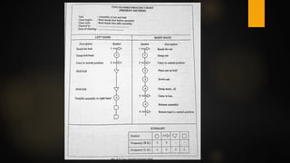 The document discusses method study, which aims to improve work processes and reduce costs. It describes the objectives and typical procedure of method study, which includes selecting a job to study, recording details, examining the method critically, developing an improved method, installing it, and maintaining the new standard. The document also explains micro-motion study and memo-motion study as techniques for recording and analyzing activities in detail or at a macro level to identify unnecessary motions and establish more efficient methods. The key difference is that micro-motion studies operations at a finer level of detail using filmed footage, while memo-motion uses time-lapse photography to study overall processes.