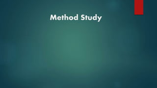 The document discusses method study, which is a technique for observing and analyzing work processes to identify opportunities for improvement. It aims to develop more efficient methods that enhance productivity and reduce costs. The methodology involves selecting a work process, recording details, critically examining the current process, developing new methods, defining the new method, installing it, and maintaining it. Common charts used in method study include outline process charts, flow process charts, two-handed process charts, and multiple activity charts. Flow process charts specifically map the sequence of operations, movements, inspections and delays for a process.