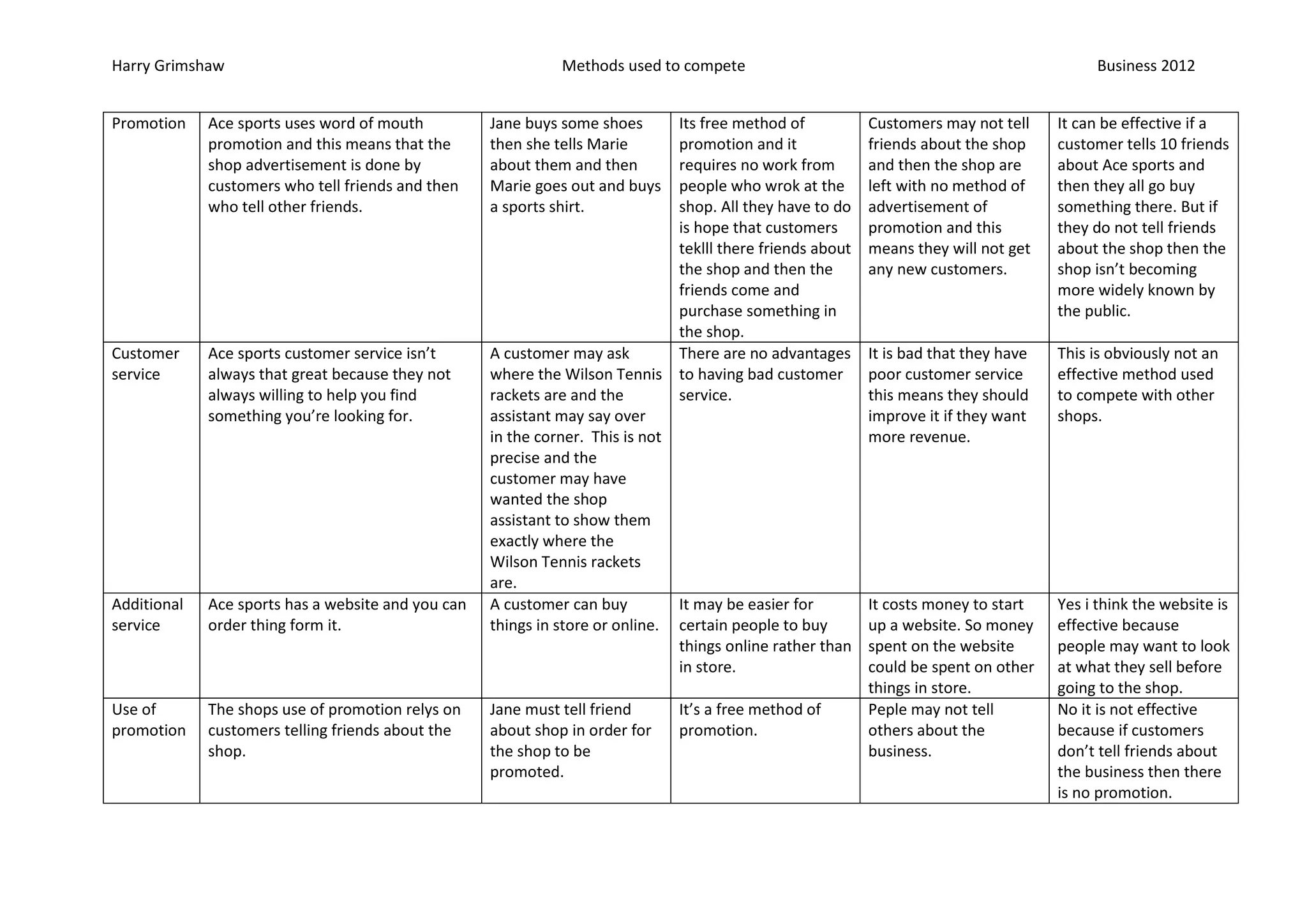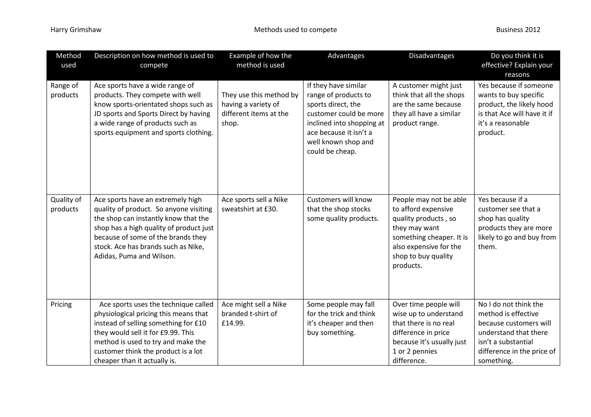 Ace Sports competes with large sports retailers like Sports Direct by maintaining a wide range of sports equipment and clothing. They aim to attract customers through their quality brand name products from Nike, Adidas, and Puma. However, their pricing technique of listing prices just under round numbers may not be effective as customers will recognize there is little real savings. While word-of-mouth promotion through satisfied customers could be a free way to advertise, it relies too heavily on customers voluntarily promoting the business without any efforts from Ace Sports to encourage promotion. Their inconsistent customer service also puts them at a disadvantage compared to larger competitors.