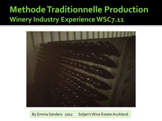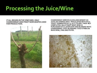The document summarizes the process for making sparkling wine using the traditional method at Soljan's Wine Estate in Auckland. [1] Grapes are harvested and the juice is fermented. [2] A starter culture is created by adding sugar, base wine, nutrients and yeast. [3] The starter culture is added to the base wine and bottled, where a second fermentation occurs to trap carbon dioxide inside and create the bubbles.
