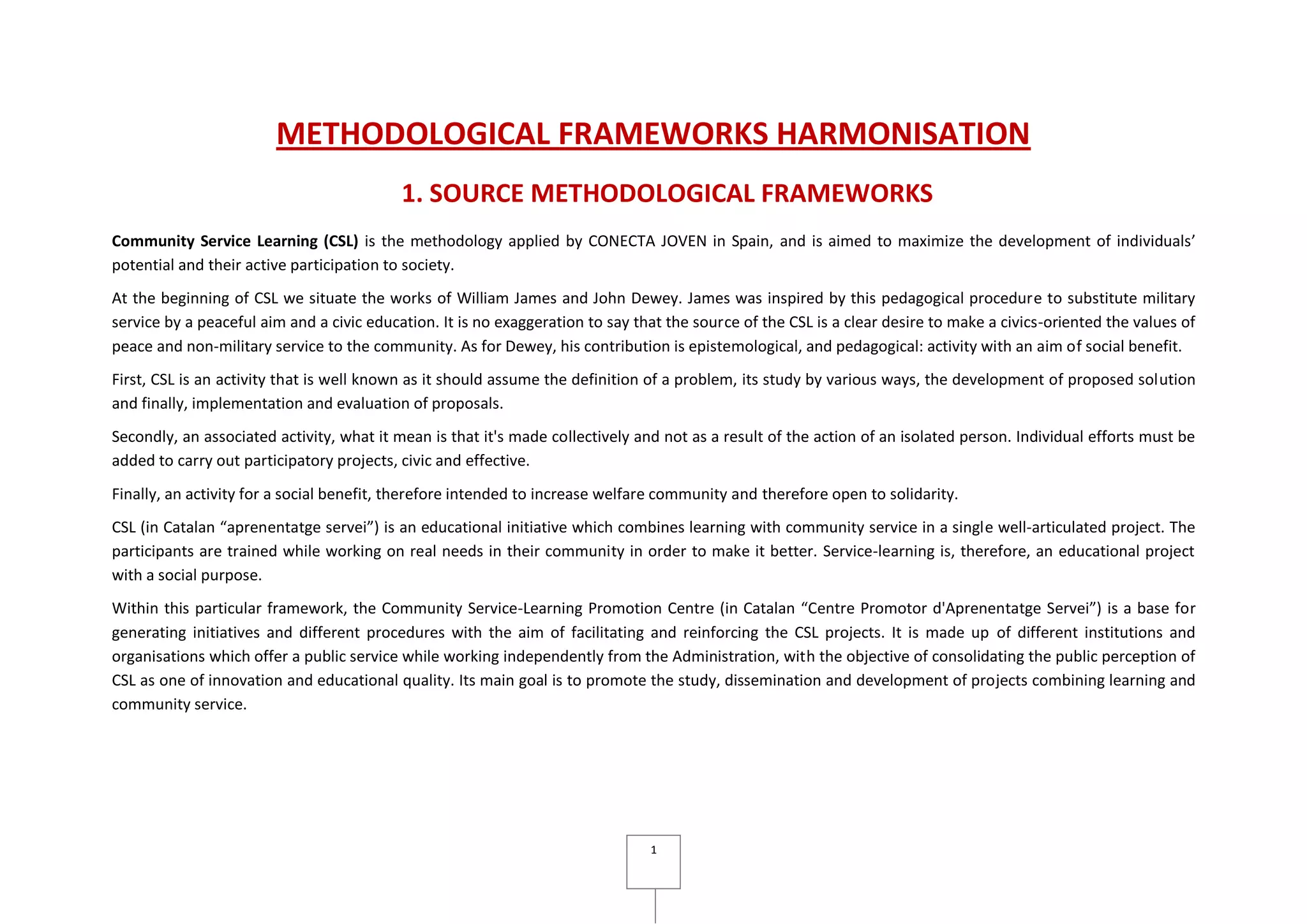 This document discusses harmonizing the methodological frameworks of Community Service Learning (CSL) and Participatory and Appreciative Action and Reflection (PAAR). It identifies key elements of each such as pillars, aims, values and processes. There are both similarities and differences between CSL and PAAR. The document proposes ways to harmonize the two approaches by taking advantages of their shared aspects like empowerment, participation and appreciation, while addressing potential divergences like CSL starting from predefined problems versus PAAR starting by identifying strengths. The goal is to develop a common methodological framework called Intergenerational Learning in Blended Environments and Spaces (ILBES) that combines the best of CSL and PA