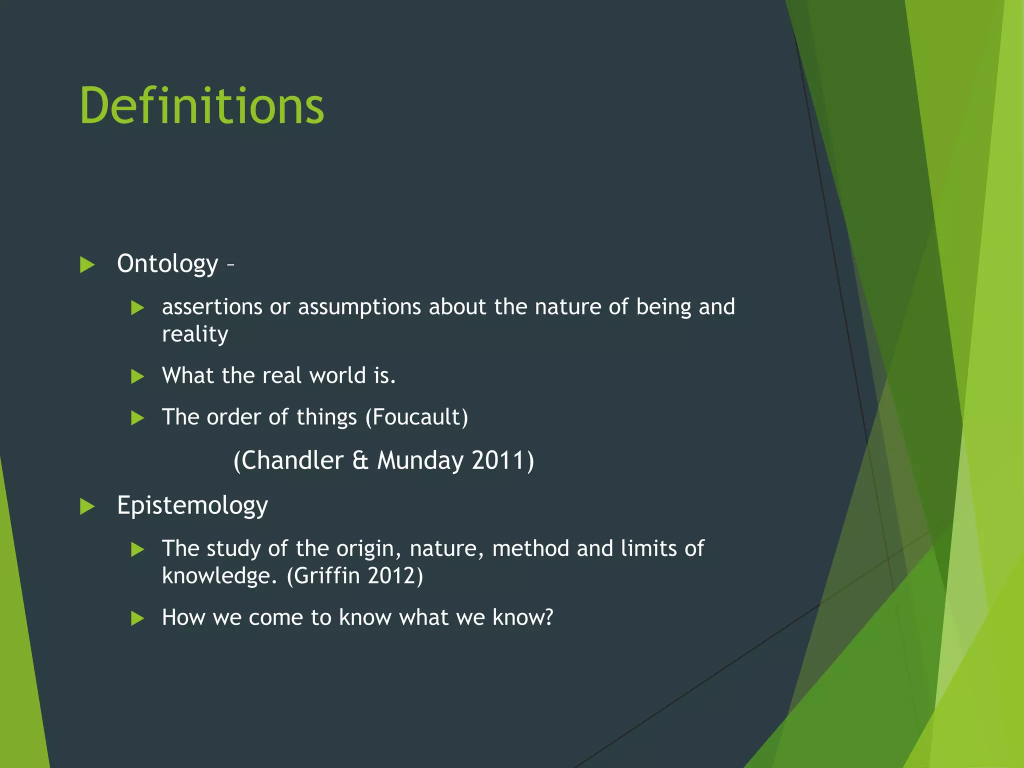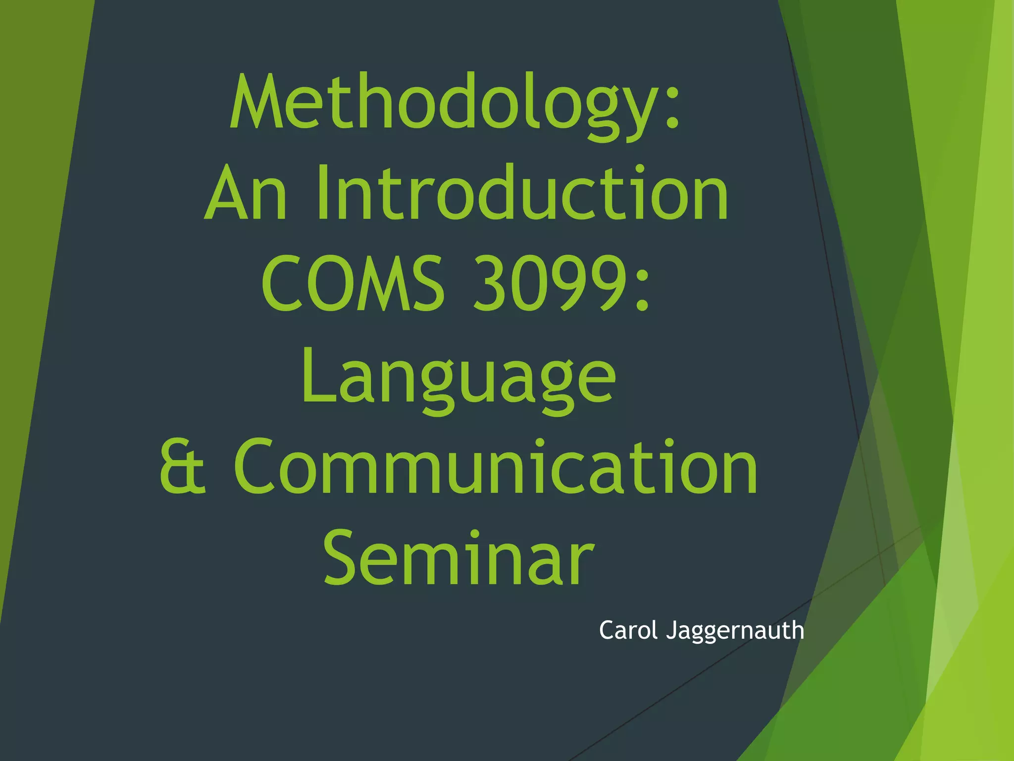 The document discusses key concepts in research methodology including definitions of ontology, epistemology, positivism, naturalism, qualitative and quantitative research. It also covers methods such as triangulation, surveys, and focus groups. Guidelines are provided for writing the methodology chapter of a research paper, including outlining the research question, data collection and analysis procedures, and justification for the chosen methods.