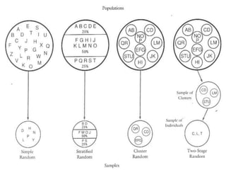 This document discusses methodology in research, including key terms and concepts. It defines methodology as how research is conducted using strategies and techniques. It then covers key aspects of the research process like population, sampling, data collection, analysis and interpretation. It distinguishes between target and accessible populations. It also defines and provides examples of different sampling techniques, including probability sampling methods like simple random sampling and cluster sampling, as well as non-probability methods like convenience and snowball sampling.