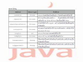 เวลาจะเรียกใช้เราต้องเรียกใช้ผ่าน object ตัวอย่างเช่น "abc".length(); หรือ String s = "This is a sample string"; boolean flag = s.contains("sample"); หมายเหตุ: เมธอด concat, toLowerCase, toUppercase จะไม่ทาการเปลี่ยนค่าของ ตัว string ที่เรียกใช้โดยตรง แต่จะ return ค่าของ string อันใหม่ที่เป็นผลลัพธ์ของเมธอด แทน ดังนั้น หากเราต้องการเปลี่ยนค่าของตัวแปรต้นฉบับโดยเมธอด concat, toLowerCase, toUppercase, etc. เราจะต้องมีการกาหนดค่าให้กับมันเอง เช่น s = s.concat("abc"); s = s.toLowerCase(); s = s.toUpperCase();