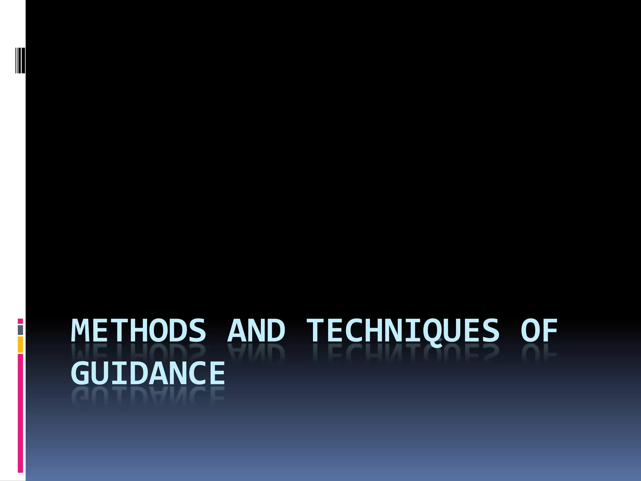 This document outlines 14 techniques for gathering guidance information about students, including administrative records, teacher reports, interviews, autobiographies, standardized tests, surveys, observations, anecdotal records, case studies, sociometry, projective techniques, rating scales, and questionnaires. Standardized tests measure various areas like achievement, intelligence, aptitudes, interests, and personality through methods such as IQ tests, aptitude tests, interest inventories, and personality inventories. Projective techniques use incomplete stimuli to project a student's underlying thoughts, like word associations, completion tasks, and picture arrangement tests.