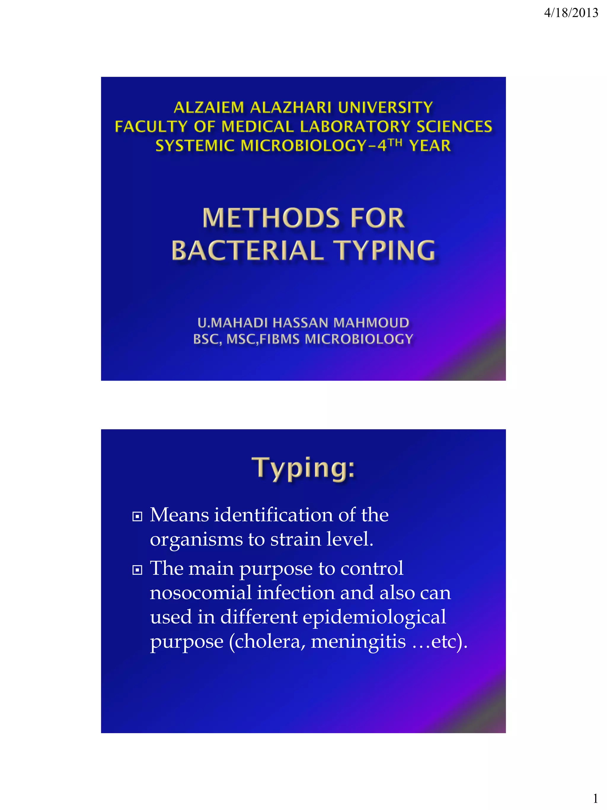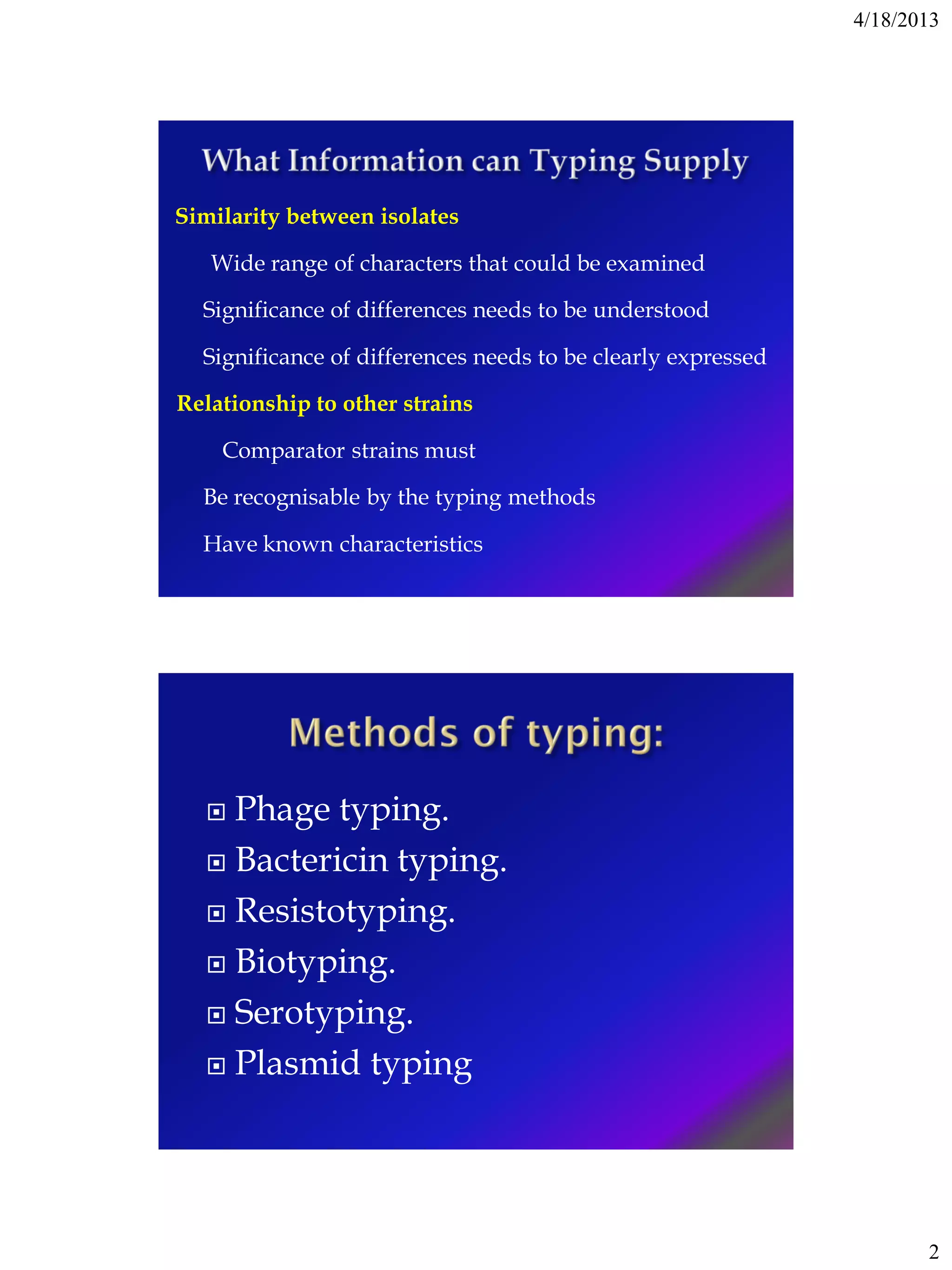 This document discusses various methods for typing bacterial strains, including phage typing, bacteriocin typing, resistotyping, biotyping, serotyping, plasmid typing, and molecular typing. Phage typing uses bacteriophages to identify bacterial strains and has been used for Staphylococcus aureus. Bacteriocin typing analyzes antibiotic-like substances produced by bacteria. Resistotyping examines sensitivity to antimicrobial agents. Biotyping, serotyping, and plasmid typing rely on biochemical reactions and presence of surface antigens or plasmids. Molecular typing uses techniques like PCR for high sensitivity and specificity but requires specialized equipment.