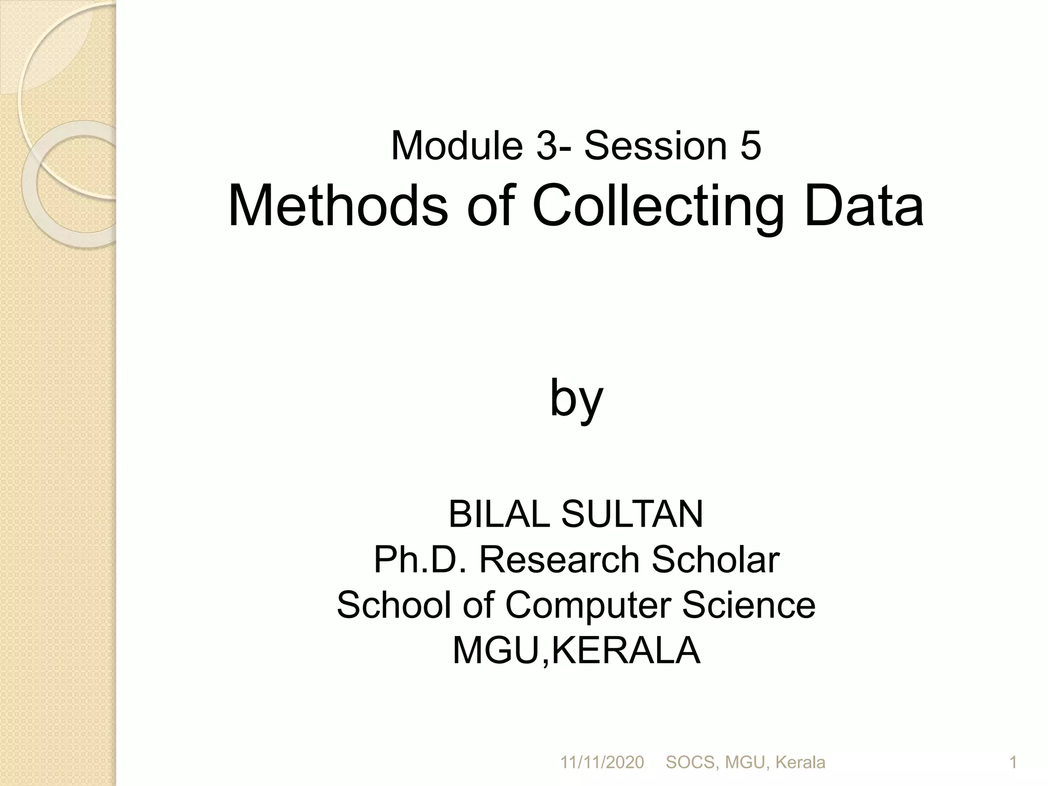 This document discusses methods of collecting data for research. It describes primary and secondary data collection. For primary data, methods include observation, interviews, questionnaires, surveys, and case studies. Observation can be structured or unstructured, while interviews are standardized or non-standardized. Secondary data involves data already collected from sources like books, journals, published websites, and organizational records. Both methods have advantages and disadvantages relating to cost, time, accuracy, and control. The document was presented by Bilal Sultan and provides an overview of key data collection techniques for research.