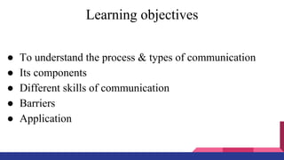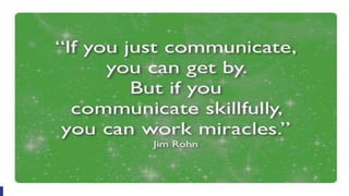 This document discusses various methods of communication. It defines communication and identifies its key components and processes. These include the sender, receiver, message, channel, encoding, decoding and feedback. The document also outlines important communication skills like listening, understanding your audience, confidence, and body language. It discusses barriers to communication such as physiological, psychological, environmental, cultural and semantic factors. Finally, it examines methods for health education communication including individual instruction, lectures, audiovisual aids, mass media, and peer discussion groups.