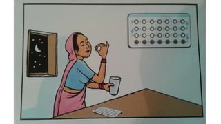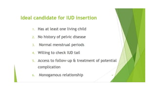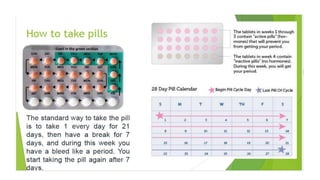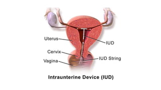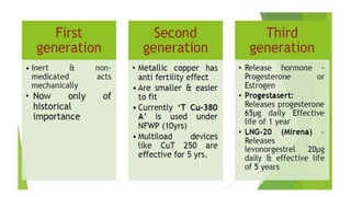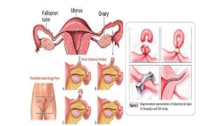 The document describes various methods of contraception, including temporary and permanent options. Temporary methods discussed include barrier methods like condoms, vaginal methods like spermicides and diaphragms, intrauterine devices (IUDs), and hormonal methods like oral contraceptive pills and injectables. Permanent methods discussed are male and female sterilization. The advantages, disadvantages, effectiveness, and other details are provided for many of the discussed contraception methods.
