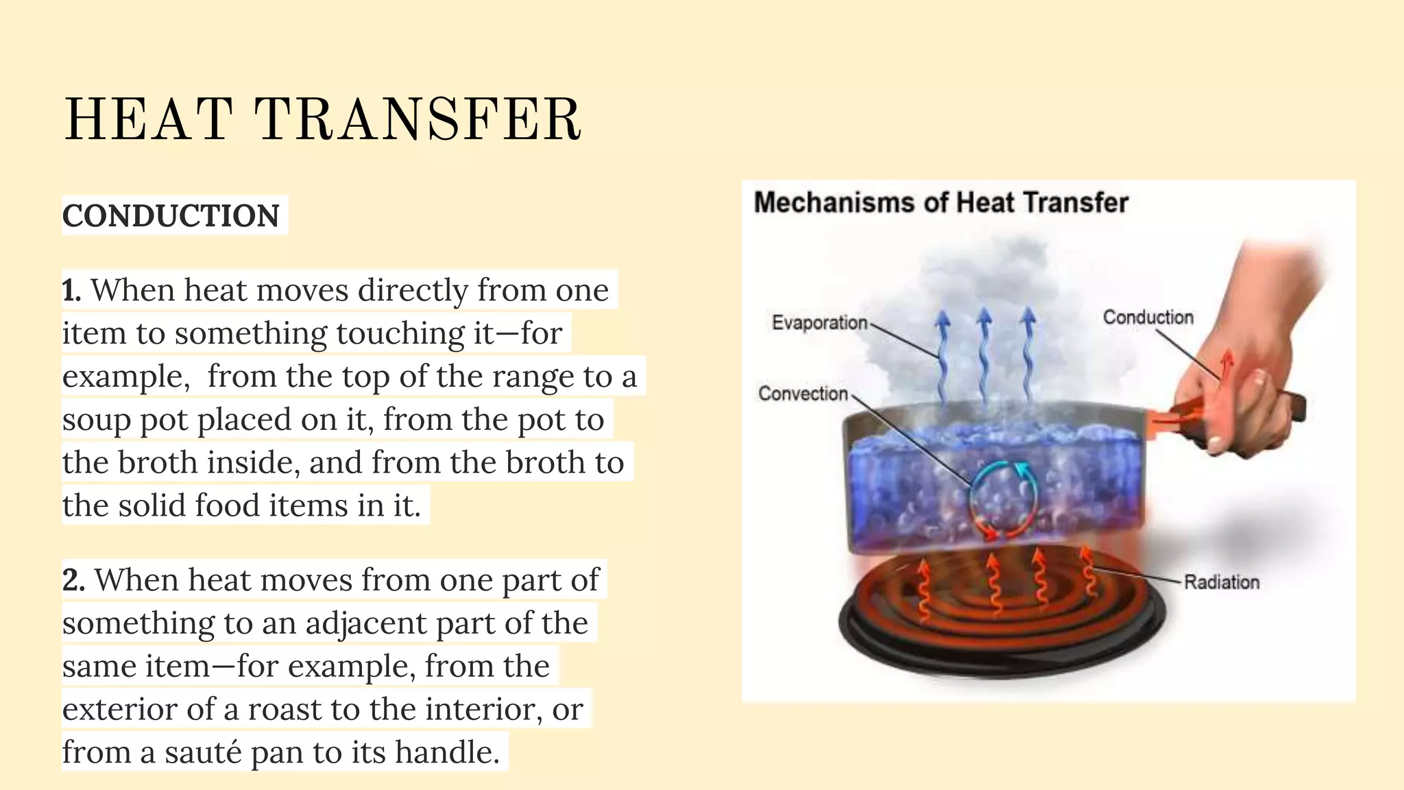 This document discusses various methods of cooking food including heat transfer methods like conduction, convection, and radiation. It then provides details on specific cooking methods like boiling, poaching, steaming, baking, roasting, grilling, shallow frying, deep frying, and microwaving. For each method, it defines the technique, provides examples of foods that can be cooked with that method, and discusses the advantages and disadvantages.