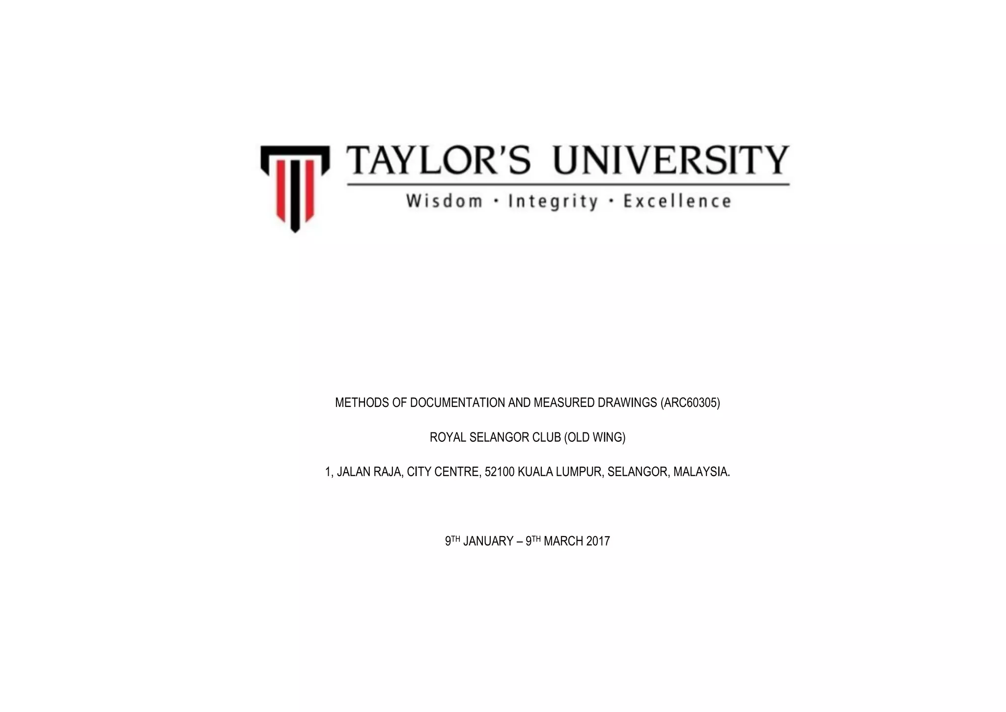 The document provides details about a project to document the Royal Selangor Club building through measured drawings and photographs. A group of 19 students measured the building over 8 weeks under the supervision of Dr. Sucharita Srirangam. The group used various equipment such as laser measures, measuring tapes, cameras and drones to fully document the building. The report includes the measured drawings, photos taken and written analysis of the building's history, architecture, construction and cultural significance.