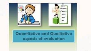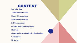 This document discusses various methods for evaluating teaching effectiveness, including direct observations, portfolios, self-assessment, grades, and rubrics. It explores both quantitative and qualitative evaluation techniques. Direct observations provide targeted feedback while student surveys offer a different perspective but require interpretation. Self-assessment is important for cultivating self-awareness. Grades incorporate metrics to rate performance while rubrics systematize evaluation through shared criteria. Both qualitative and quantitative data are needed to capture the complexities of teaching quality. Comprehensive evaluation helps identify strengths and areas for improvement to enhance student learning.