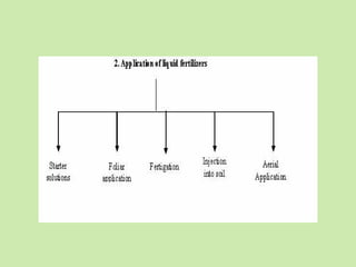 3. Specialized techniques like starter solutions, foliar application, fertigation through irrigation, soil injection of liquids, and aerial spraying for certain crops and terrains. The key is applying fertilizer at the right time, rate, method to maximize nutrient availability and crop uptake while minimizing losses.