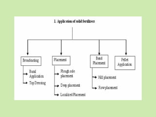 2. Placement methods like broadcasting, drilling, banding and pellet application to distribute fertilizer evenly or close to plants.
