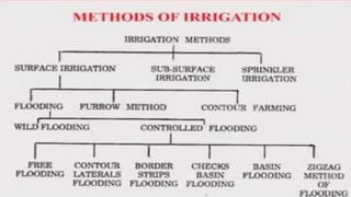Irrigation is the process of applying water to crops artificially to meet their water requirements. The sources of water include wells, ponds, lakes, canals and dams. The frequency, amount and timing of irrigation varies depending on the crop type, soil type, and season. Surface irrigation involves applying water over the soil surface through gravity, such as flood irrigation where fields are flooded. Subsurface irrigation uses underground pipes to apply treated wastewater below the surface to irrigate plant roots while minimizing runoff and exposure. Sprinkler systems use high pressure pumps to spray water through nozzles like rainfall over a wide area.