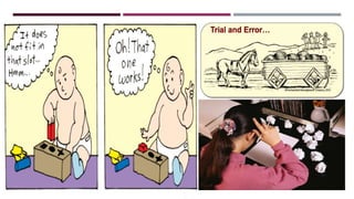 There are four main methods of learning discussed in the document: learning by trial and error, learning by imitation, learning by insight, and learning by doing. Learning by trial and error involves repeatedly trying solutions to a problem until finding one that works. Learning by imitation occurs when observing and replicating the behaviors of others. Learning by insight is solving a problem suddenly without gradual trial and error. Learning by doing means gaining skills and knowledge directly from carrying out and practicing a task.