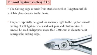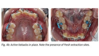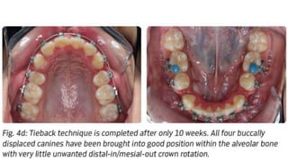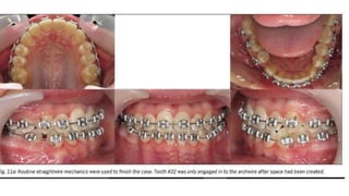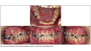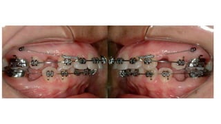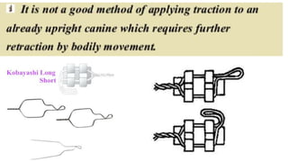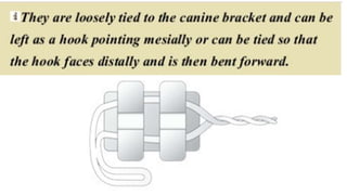 This document discusses different methods of ligation in orthodontics. It describes conventional elastic or metallic ligation as well as newer self-ligating methods built into brackets. The three most common ligation systems are discussed as active/passive self-ligation and conventional elastic ligation. Research has shown passive self-ligation decreases forces and moments compared to elastic ligation. Tiebacks and lacebacks are described as methods to retract canines into extraction spaces, with tiebacks using elastics and lacebacks using direct wires from molars to canines.