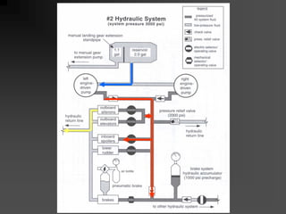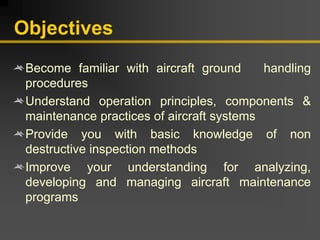 The document provides an overview of aircraft maintenance training. It covers topics like aircraft ground handling procedures, aircraft systems including hydraulic, pneumatic, flight control and landing gear systems, aircraft engines, and environmental control systems. The course outline includes sections on aircraft ground handling, aircraft systems, corrosion inspection methods, and aircraft maintenance planning. Key components and functions of different aircraft systems are described in further detail.