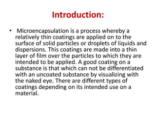 This document discusses various methods of microencapsulation. It describes three main techniques: mechanical, chemical, and physicochemical. The mechanical methods discussed are pan coating and Wurster coating, which use mechanical processes to apply coatings. The chemical methods include polymerization, which forms coatings through chemical reactions. Physicochemical methods use phase separation and coacervation to deposit coatings. Specific processes within each method like emulsion polymerization and temperature-induced coacervation are also outlined. Key processing steps and variables are identified for various microencapsulation techniques.