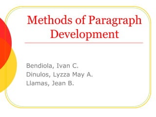 This document outlines 10 methods for paragraph development: narration, cause and effect, description, analogy, comparison/contrast, classification, exemplification/functional analysis, facts, and definition. Each method is defined informally and describes its typical components, purposes, and types. Narration uses storytelling techniques while cause and effect examines reasons and results. Description represents subjects visually and analogy makes extensive comparisons.