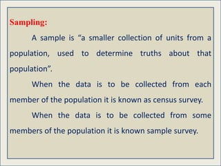 This document discusses different types of probability sampling methods used in business research. It describes simple random sampling as the easiest where each unit has an equal chance of being selected. Systematic random sampling selects the first unit randomly and then every nth unit thereafter. Stratified random sampling divides the population into subgroups and randomly samples from each subgroup. Cluster sampling divides the total population into clusters and then randomly samples clusters.