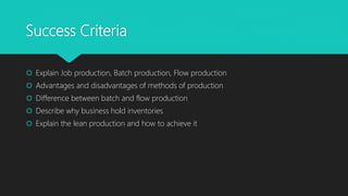 This document summarizes three common methods of production: job production, batch production, and flow production. It explains that job production involves manual production of unique products on a made-to-order basis. Batch production involves producing set quantities of goods together in batches before starting the next batch. Flow production is high-volume mass production of standardized items on a continuous basis. It also discusses the differences between batch and flow production, why businesses hold inventories, and the concept of lean production which aims to maximize value through eliminating waste.