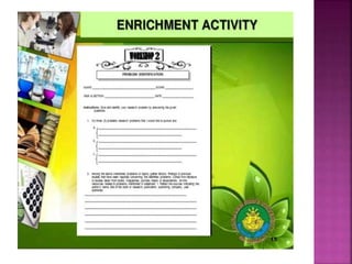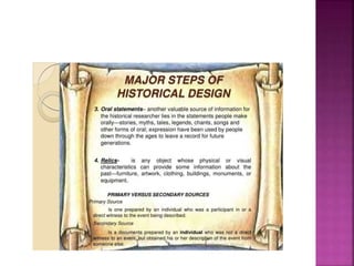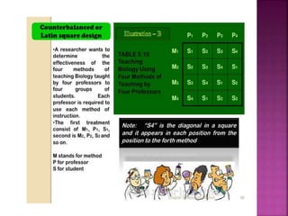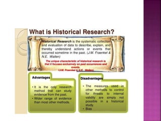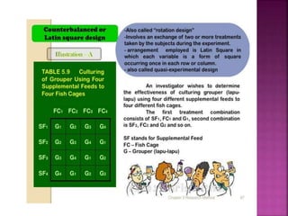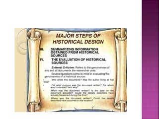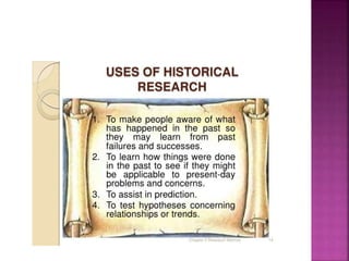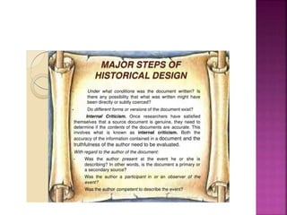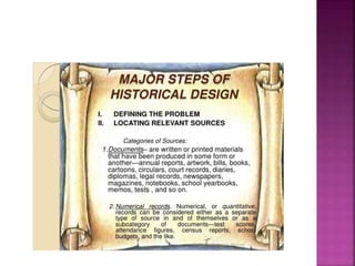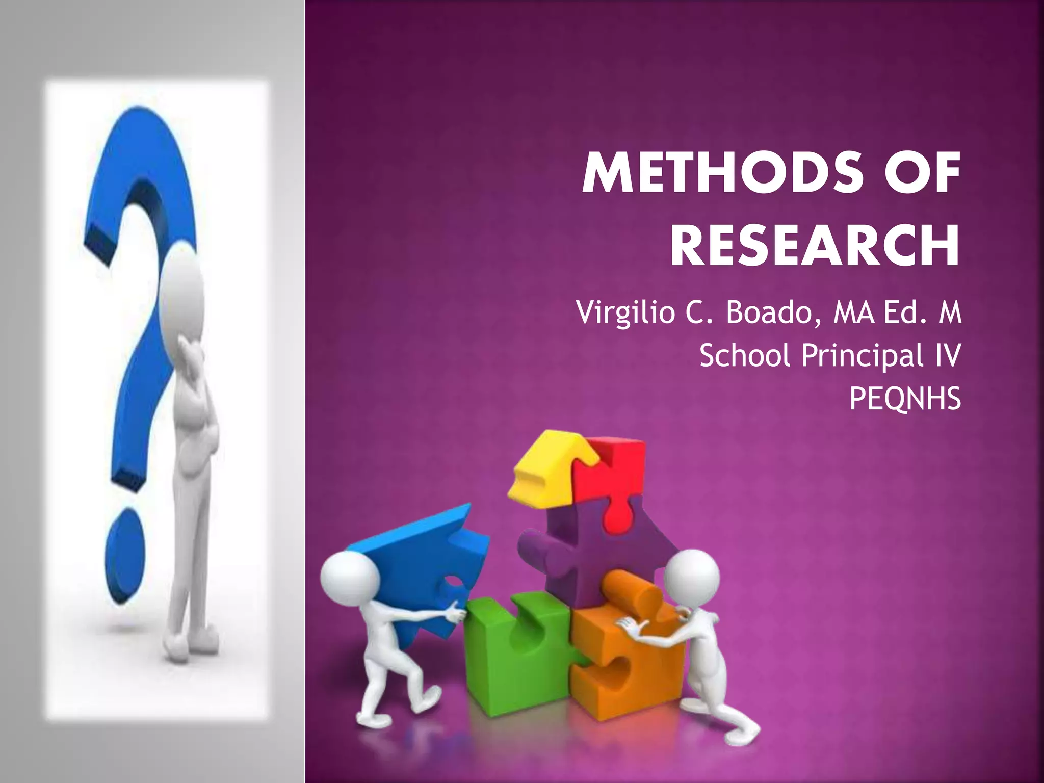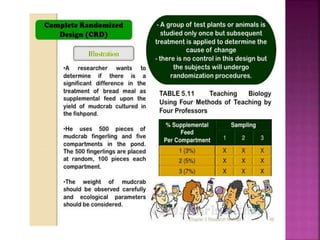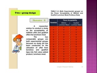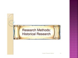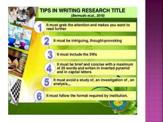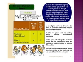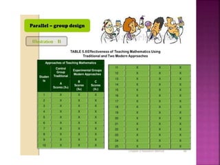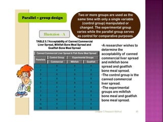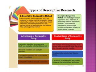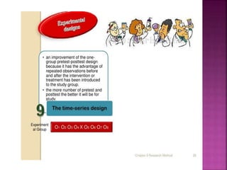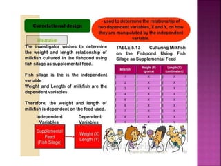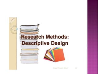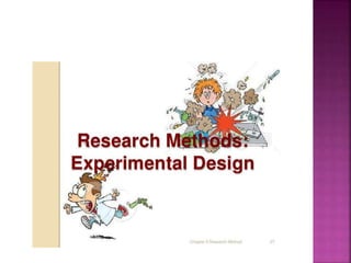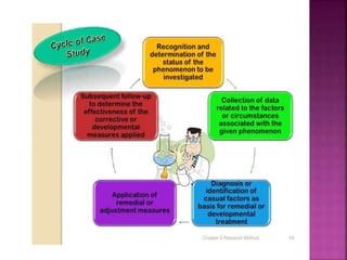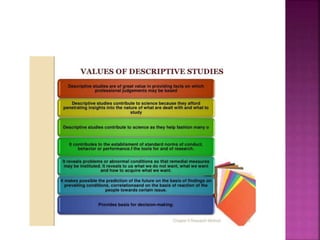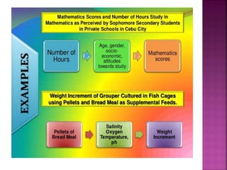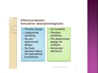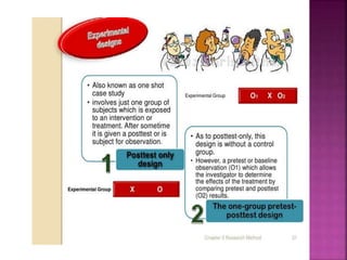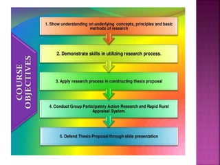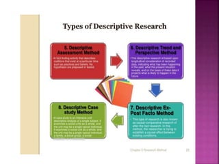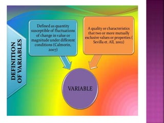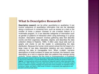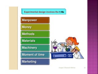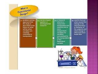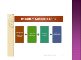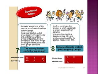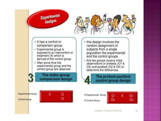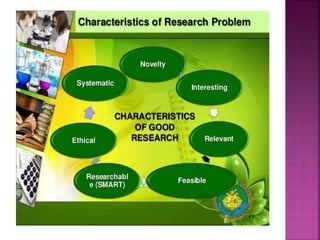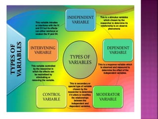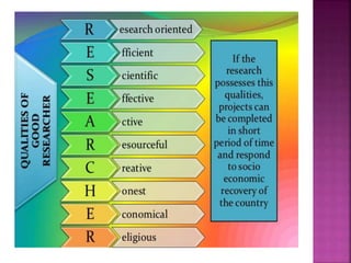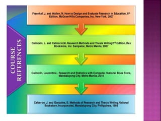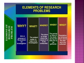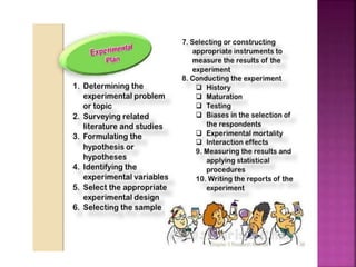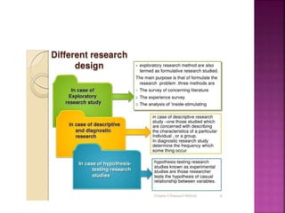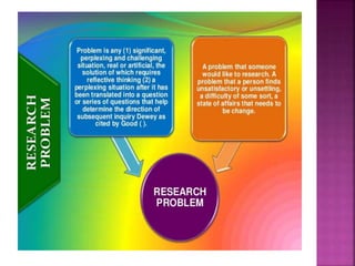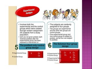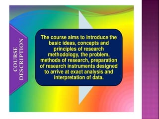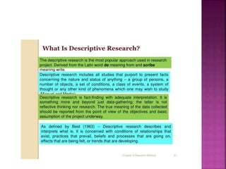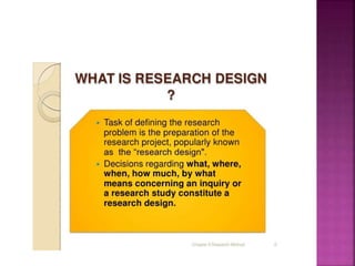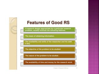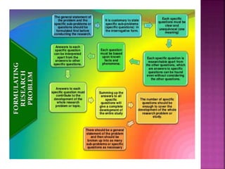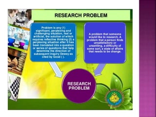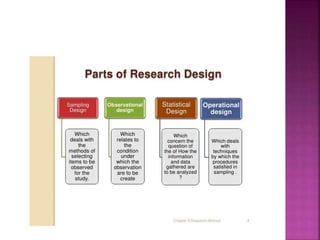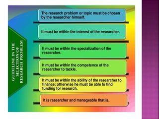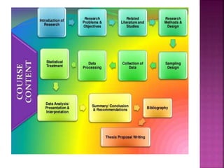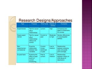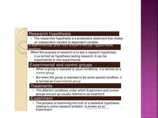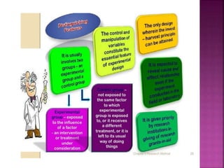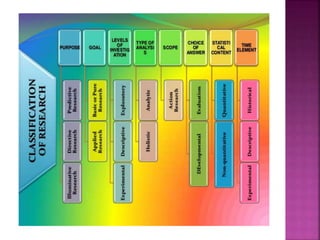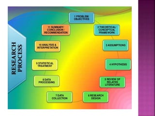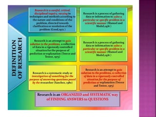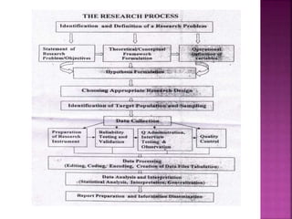 This document outlines the key components and processes of conducting research. It discusses defining research problems and objectives, developing hypotheses, reviewing related literature, choosing appropriate research designs (such as descriptive, experimental, correlational), determining sample sizes and sampling methods, collecting and analyzing data, and presenting findings. It also covers important concepts like validity, reliability, and operationalizing definitions. The overall purpose is to provide guidance to researchers on how to properly plan and carry out a study.