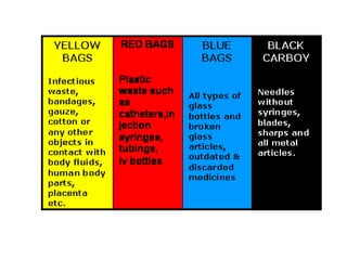 This document discusses various methods of solid waste management including composting, incineration, pyrolysis, and sanitary landfilling. It provides details on pyrolysis such as the byproducts generated from burning waste at high temperatures in an oxygen-free atmosphere. Sanitary landfilling techniques are explained with diagrams of landfill cross-sections. The document also covers hazardous waste management, categorizing waste types, and describing the management of biomedical, radioactive, and e-waste specifically. Flow charts and images are referenced to provide visual explanations of concepts like biomedical waste collection bins and treatment processes.
