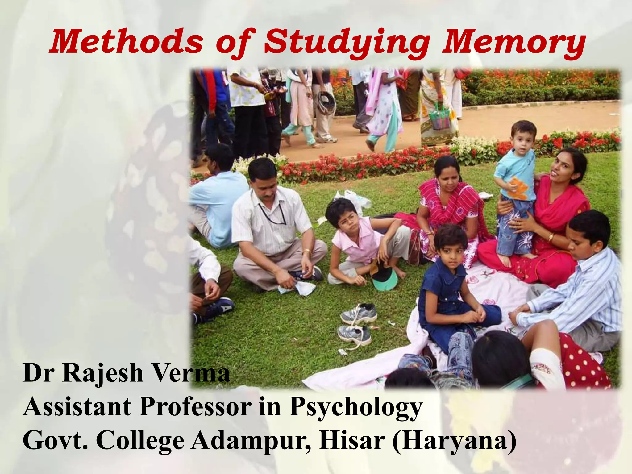 The document outlines various scientific methods for studying memory, initially introduced by Hermann Ebbinghaus. Key methods include recall, recognition, sentence verification, priming, relearning, and reconstruction, each designed to measure different aspects and types of memory. The document explains these techniques, their applications, and provides formulas for quantifying memory retention.