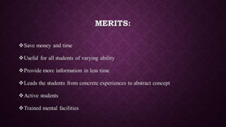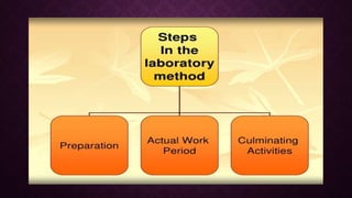 The document discusses different teaching methods: lecture-demonstration, project method, and laboratory method. It provides details on the project method, including its definition, steps involved, advantages like maintaining student interest, and disadvantages like potential misuse of time. The laboratory method is described as utilizing real data/materials to improve understanding and develop skills like observation. Preparation, the work period, and culminating activities are outlined for effective use of these methods.