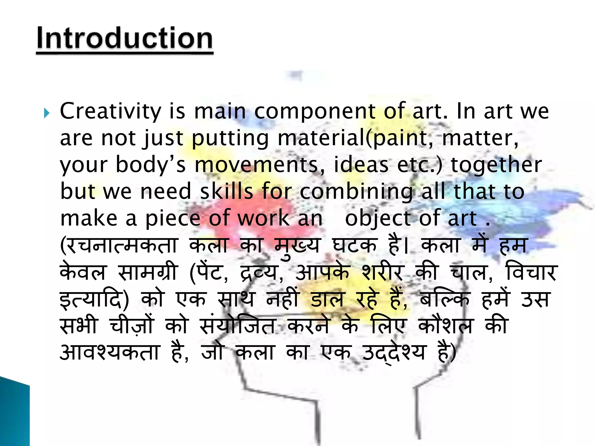 The document discusses methods for enhancing creativity and imagination in art. It states that creativity relies on skills to combine various materials and ideas. Imagination is closely tied to creativity as it involves envisioning new concepts and alternatives. A strong knowledge base is important for imagination and creativity. The document provides various approaches teachers can use to open students up to creative self-expression, such as discussion, introducing new materials, field trips and role playing. Nurturing imagination can improve students' artistic skills, knowledge, emotional strength, personality and creativity.