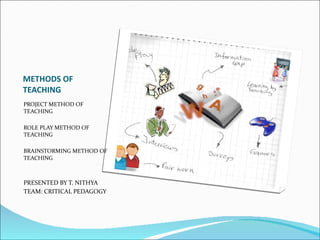 The document describes several methods of teaching including project method, role play method, and brainstorming method. It provides details on the principles, steps, roles of teachers, advantages and limitations of each method. Project method involves creating and completing meaningful projects. Role play allows students to enact scenarios to reflect on concepts. Brainstorming encourages creative idea generation by having students freely share ideas without criticism.