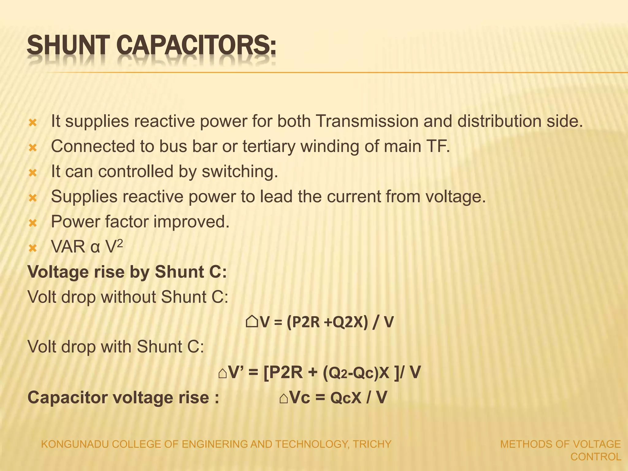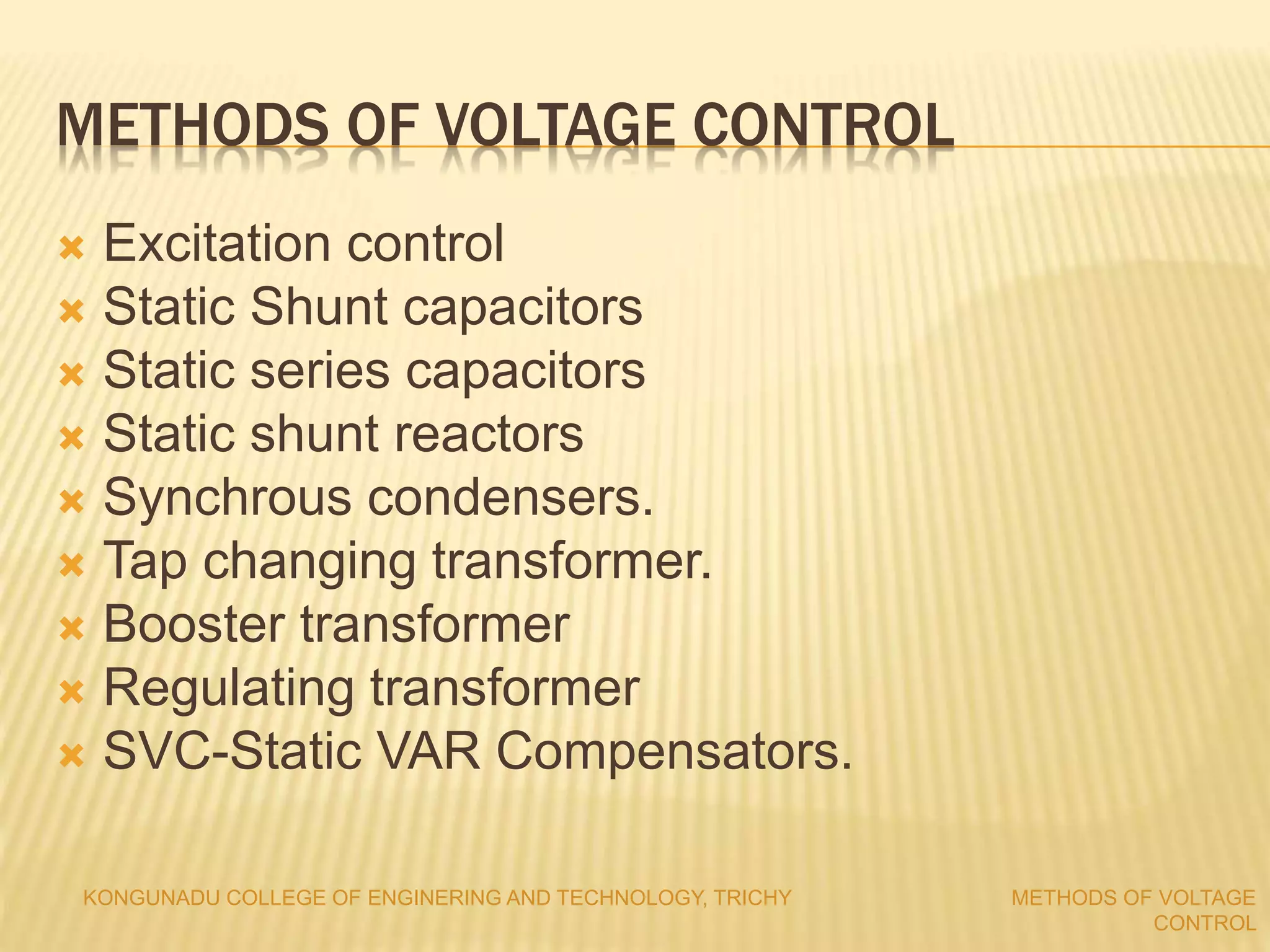 This document discusses various methods of voltage control in power systems, including static shunt capacitors, static series capacitors, static shunt reactors, synchronous condensers, tap changing transformers, booster transformers, and SVC-Static VAR Compensators. Static shunt capacitors and static series capacitors inject reactive power to increase voltage, while static shunt reactors absorb reactive power to reduce voltage. Synchronous condensers can operate as either capacitors or reactors depending on their excitation to regulate voltage. Tap changing transformers and booster transformers also control voltage through adjusting transformer ratios.