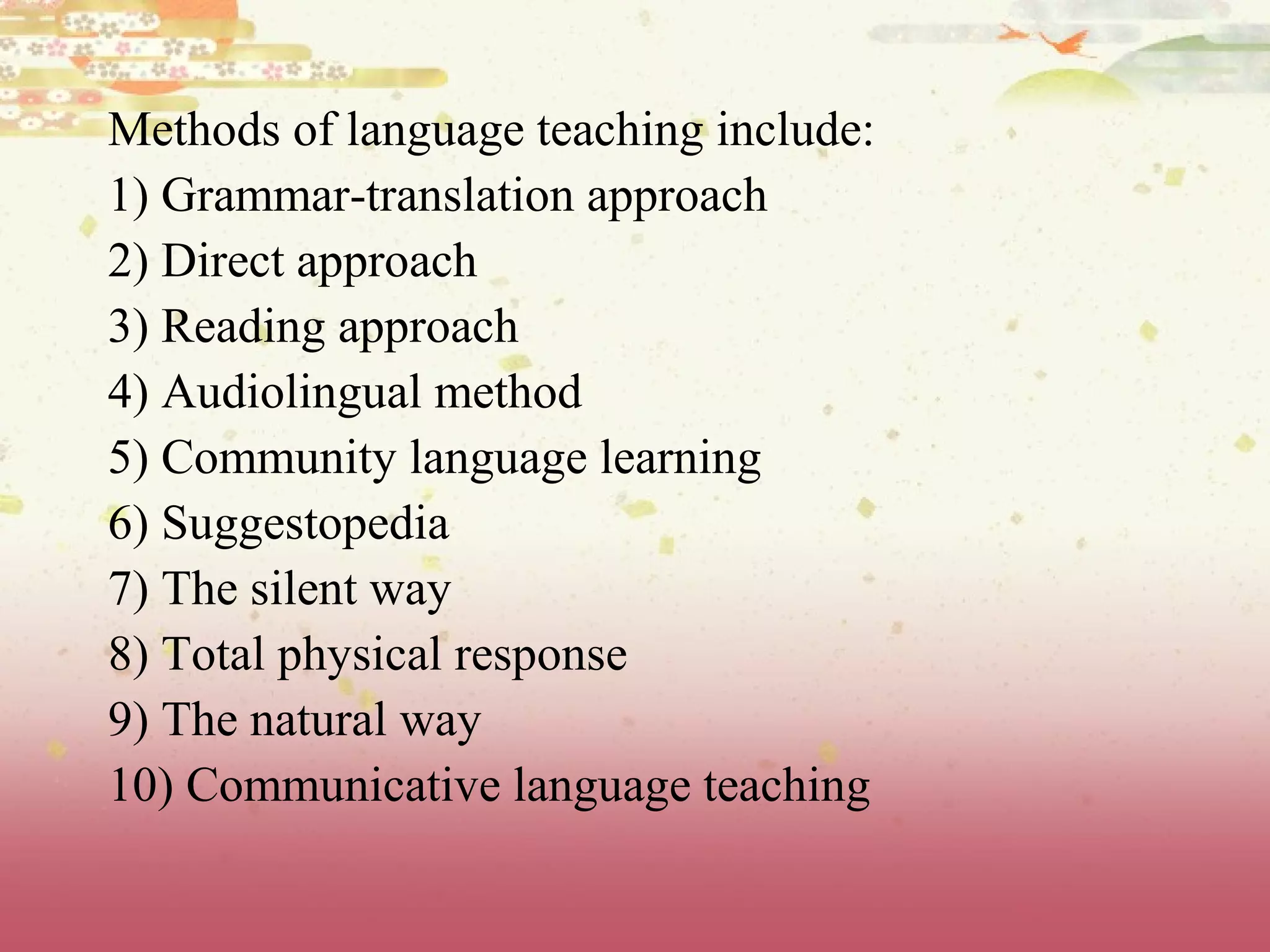 This document outlines 10 major methods of language teaching: grammar-translation, direct, reading, audiolingual, community language learning, suggestopedia, the silent way, total physical response, the natural way, and communicative language teaching. For each method, the document provides details on techniques, principles, procedures, and examples of implementation in language classrooms.