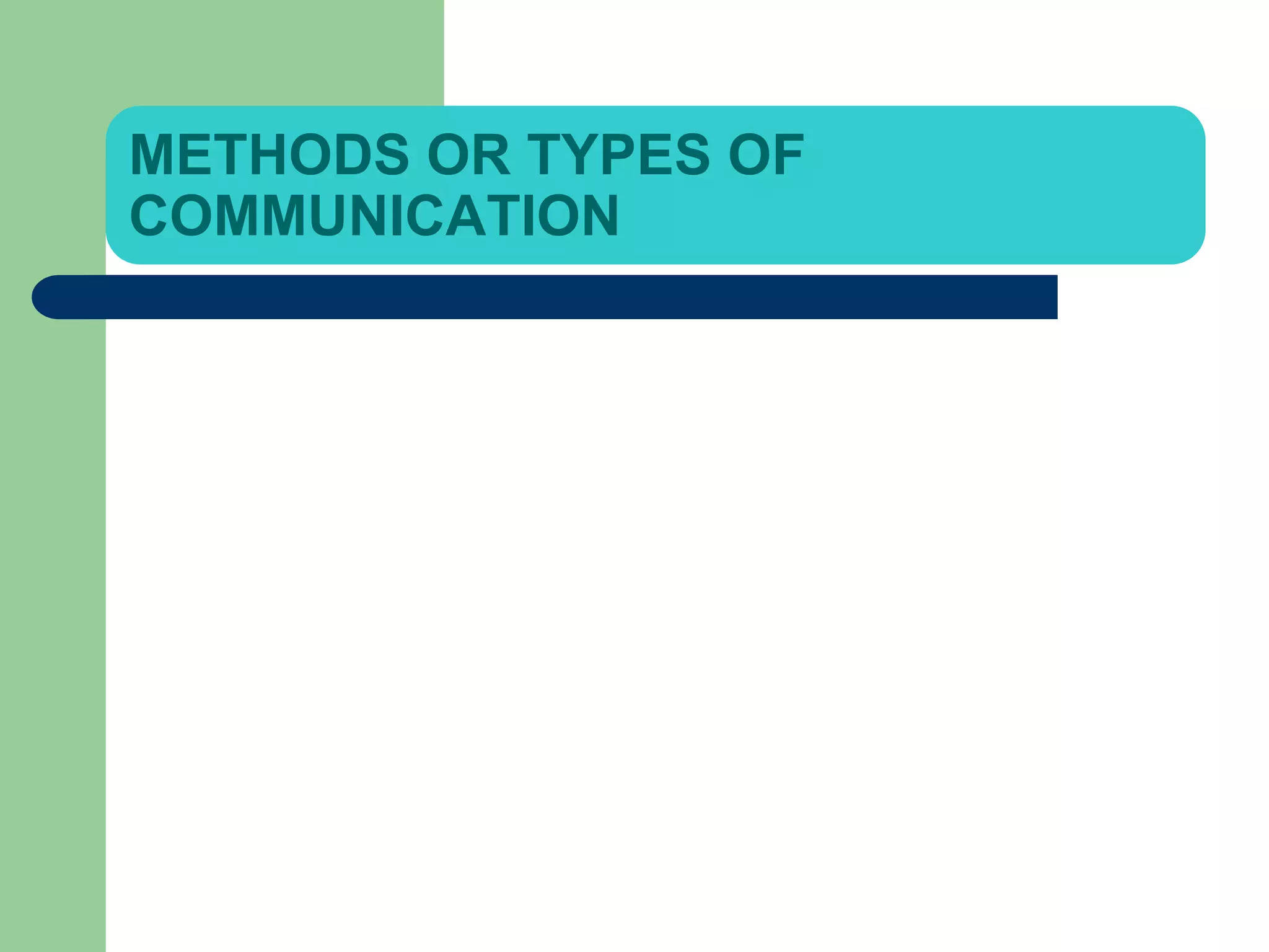 The document discusses different types and methods of communication. It categorizes communication based on organizational structure, direction of information flow, and media used. Formal communication follows official channels laid out in an organization's structure, while informal "grapevine" communication occurs outside formal networks through interpersonal relationships. Some key differences between formal and informal communication are that formal is based on position and slow, while informal is faster but prone to distortion and leaks confidential information. Methods of each type are also outlined.