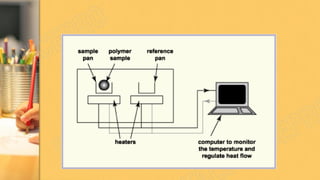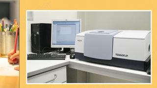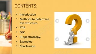 There are three main methods to determine dye chemistry: Fourier transform infrared spectroscopy (FTIR), differential scanning calorimetry (DSC), and infrared (IR) spectroscopy. FTIR identifies chemical bonds by detecting molecular absorption of infrared radiation. DSC measures heat flows involved in material transitions as a function of temperature. IR spectroscopy identifies functional groups based on their absorption of infrared radiation frequencies. An example analyzed the functional groups of a commercially available inkjet printing reactive dye using IR spectroscopy to understand its chemical structure.