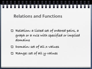 This document defines and describes relations and functions. It explains that a relation is a set of ordered pairs, graph or rule with domains and ranges. Relations can be one-to-one, many-to-one, one-to-many, or many-to-many. A function is a special type of relation that is many-to-one, where a vertical line can only cross the graph once. Functions can be one-to-one or many-to-one, and a one-to-one function's inverse is its reflection across the line y=x.