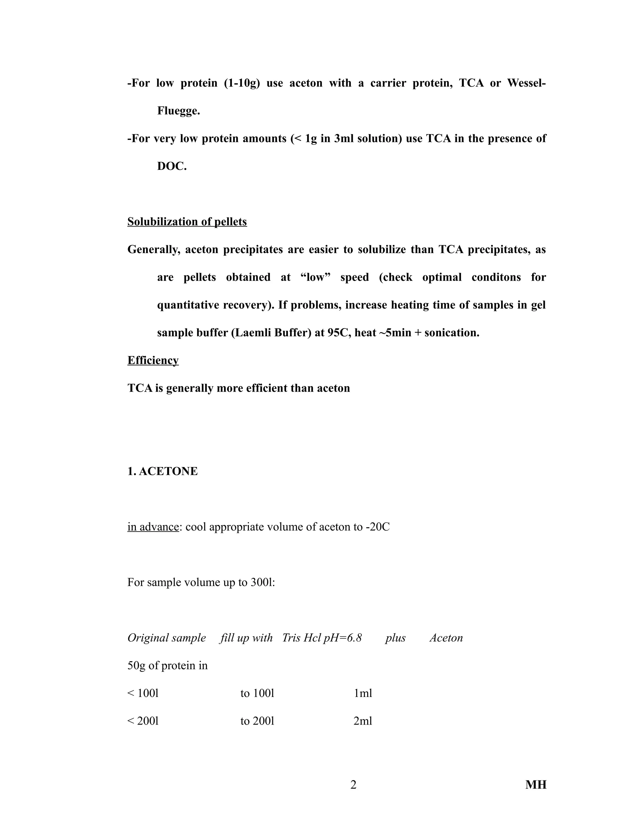 This document describes four common methods for precipitating proteins from solution: acetone precipitation with or without a carrier protein, trichloroacetic acid (TCA) precipitation with deoxycholate, and methanol/chloroform precipitation. It provides details on sample volumes, reagents, steps, and notes the efficiency and ease of solubilizing pellets for each method. TCA precipitation is generally the most efficient but acetone precipitation produces pellets that are easiest to solubilize. The document aims to provide guidance on selecting the appropriate protein precipitation technique based on sample characteristics like protein amount and composition.