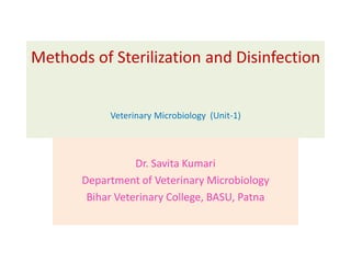 This document defines key terms related to sterilization and disinfection. It discusses various physical and chemical methods for sterilizing and disinfecting, including heat, radiation, filtration, and chemicals. Heat-based methods include moist heat using steam or boiling water and dry heat using ovens or flames. Radiation includes UV and ionizing radiation. Filtration separates microbes from liquids using various filter types. Common chemical disinfectants discussed are phenols, halogens, alcohols, aldehydes, and heavy metals. The ideal properties and mechanisms of action for disinfectants are also summarized.
