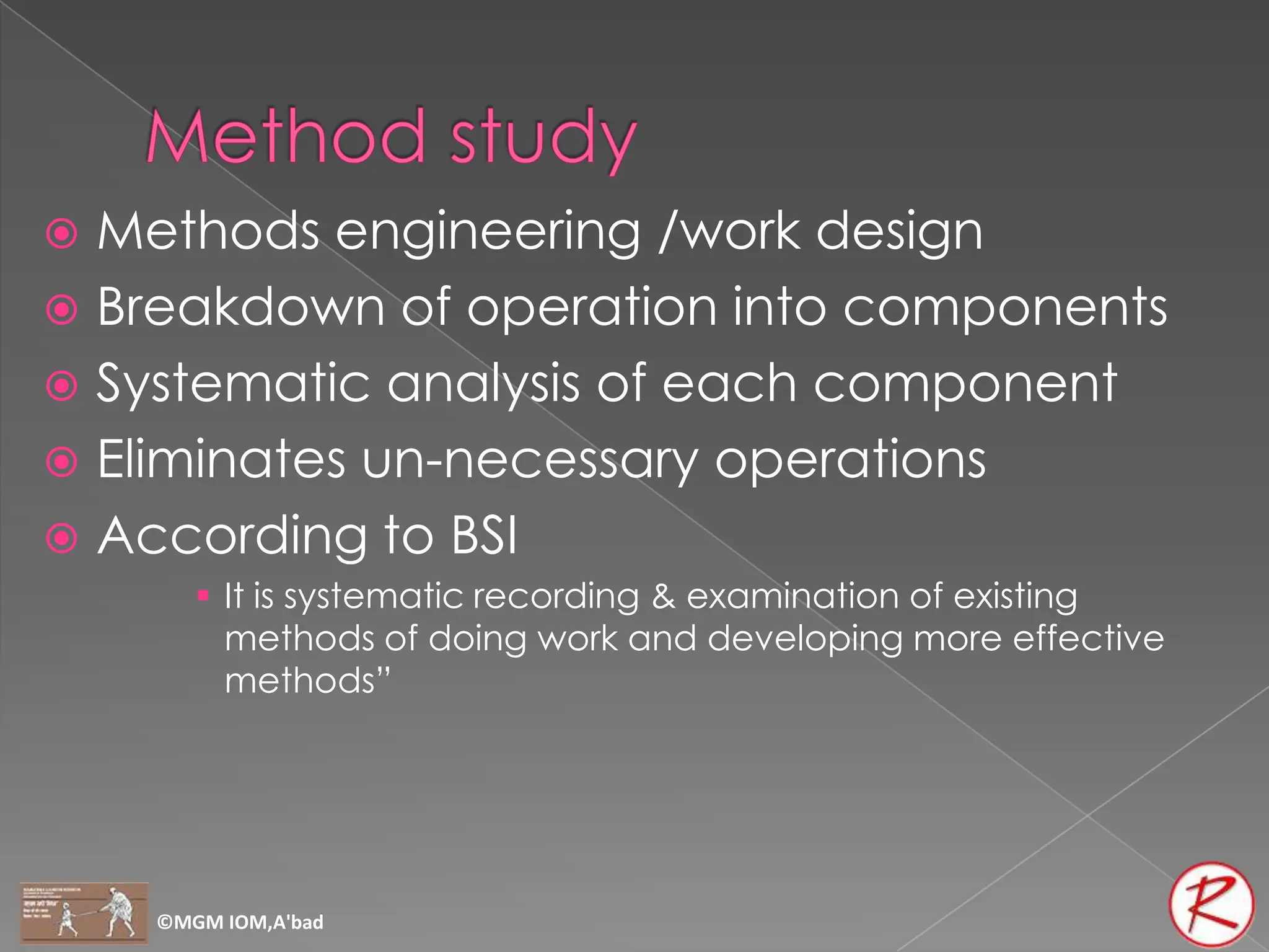 This document discusses various methods and techniques for conducting a method study, which is a systematic analysis and improvement of work methods. It describes the basic procedure for a method study as selecting, recording, examining, developing, evaluating, defining, installing, and maintaining improved methods. Various charts and diagrams that can be used in the recording and analysis phases are explained, including operation process charts, flow process charts, two-handed process charts, multiple activity charts, flow diagrams, string diagrams, SIMO charts, and therblings analysis. The overall aim of a method study is to eliminate unnecessary operations and make work methods more efficient.