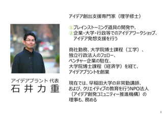 ⼒ 重 アイデア創出⽀援専⾨家(理学修⼠) ①ブレインストーミング道具の開発や、 ②企業・⼤学・⾏政等でのアイデアワークショップ、 アイデア発想⽀援を⾏う 商社勤務、⼤学院博⼠課程(⼯学)、 独⽴⾏政法⼈のフェロー、 ベンチャー企業の駐在、 ⼤学院博⼠課程(経済学)を経て、 アイデアプラントを創業 現在では、早稲⽥⼤学の⾮常勤講師、 および、クリエイティブの教育を⾏うNPO法⼈ (アイデア創発コミュニティー推進機構)の 理事も、務める