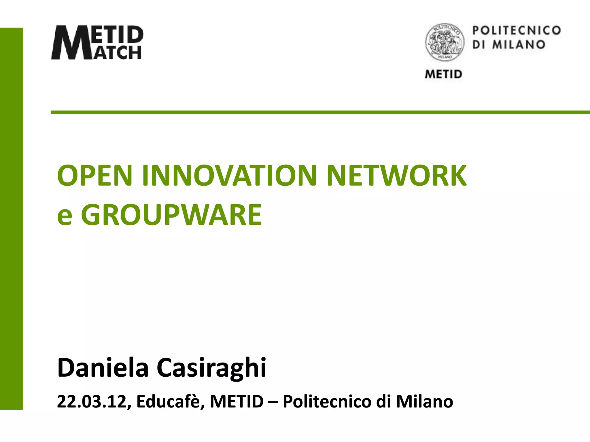 The document discusses the concept of open innovation, which challenges traditional closed innovation by advocating for the use of both internal and external ideas in technological advancement. It highlights the significance of collaborative innovation networks and ethical principles guiding such collaborations, supported by examples like OpenIDEO and Innocentive. Additionally, it addresses opportunities for students and educational institutions to engage with international design projects and enhance research activities through open innovation frameworks.