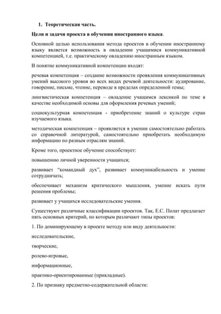 Этот документ представляет методические рекомендации по использованию проектного метода в обучении иностранным языкам в средне-специальных учреждениях. Метод проектов способствует развитию коммуникативной компетенции, творческих и исследовательских умений учащихся, а также необходимого понимания культурные аспекты изучаемого языка. Описывается структура проектной деятельности, включая цели, этапы работы и виды проектов с примерами практического применения на уроках.