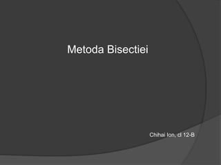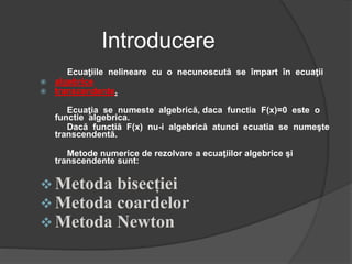 Documentul discută metoda bisecției pentru rezolvarea ecuațiilor nelineare și clasifică ecuațiile în algebrice și transcendente. Metoda bisecției este o tehnică de determinare a soluției ecuației f(x) = 0 pe un interval dat, asigurându-se existența unei soluții prin proprietățile funcției. Deși are o viteză de convergență redusă, aceasta oferă o metodă sigură și stabilă pentru ecuații cu rădăcini simple.