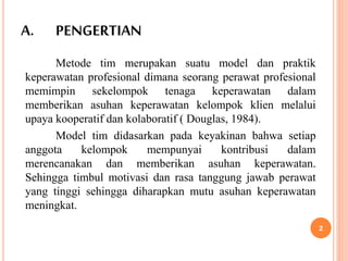Dokumen ini menjelaskan metode keperawatan tim, yaitu model asuhan keperawatan yang dipimpin oleh seorang perawat kompeten yang mengkoordinasikan anggota tim untuk memberikan pelayanan komprehensif. Kelebihan metode ini termasuk peningkatan komunikasi dan kerja sama tim, sementara kelemahan mencakup tantangan dalam koordinasi dan perlunya keterampilan tinggi. Tanggung jawab kepala ruang dan ketua tim juga ditekankan untuk memastikan efektivitas model tim dalam asuhan keperawatan.