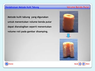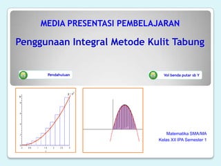 Dokumen ini menjelaskan metode kulit tabung untuk menghitung volume benda putar pada mata pelajaran matematika kelas XII. Contoh yang diberikan melibatkan pemutaran kurva y = x2 dan garis x = 2 di sekitar sumbu y untuk menentukan volume. Prosesnya melibatkan pembuatan partisi, aproksimasi volume, dan perhitungan dalam bentuk integral.