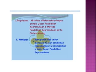 Dokumen tersebut membahas metode membina Pramuka Siaga yang sesuai dengan tujuannya. Metode kepramukaan meliputi belajar sambil melakukan kegiatan menarik di alam terbuka dengan bimbingan orang dewasa, serta sistem penghargaan berupa tanda kecakapan. Contoh metode yang digunakan adalah menyanyi dan mendongeng di alam terbuka dengan kehadiran pembina untuk memberikan dorongan.