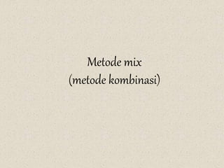 Metode penelitian kombinasi (mixed research) menggabungkan pendekatan kualitatif dan kuantitatif untuk mendapatkan data yang lebih komprehensif dan objektif. Terdapat dua jenis utama, yaitu metode sequential dan concurrent, yang membagi proses penelitian dalam urutan atau waktu yang sama. Metode ini digunakan untuk mencapai hasil penelitian yang lebih valid dan reliabel.
