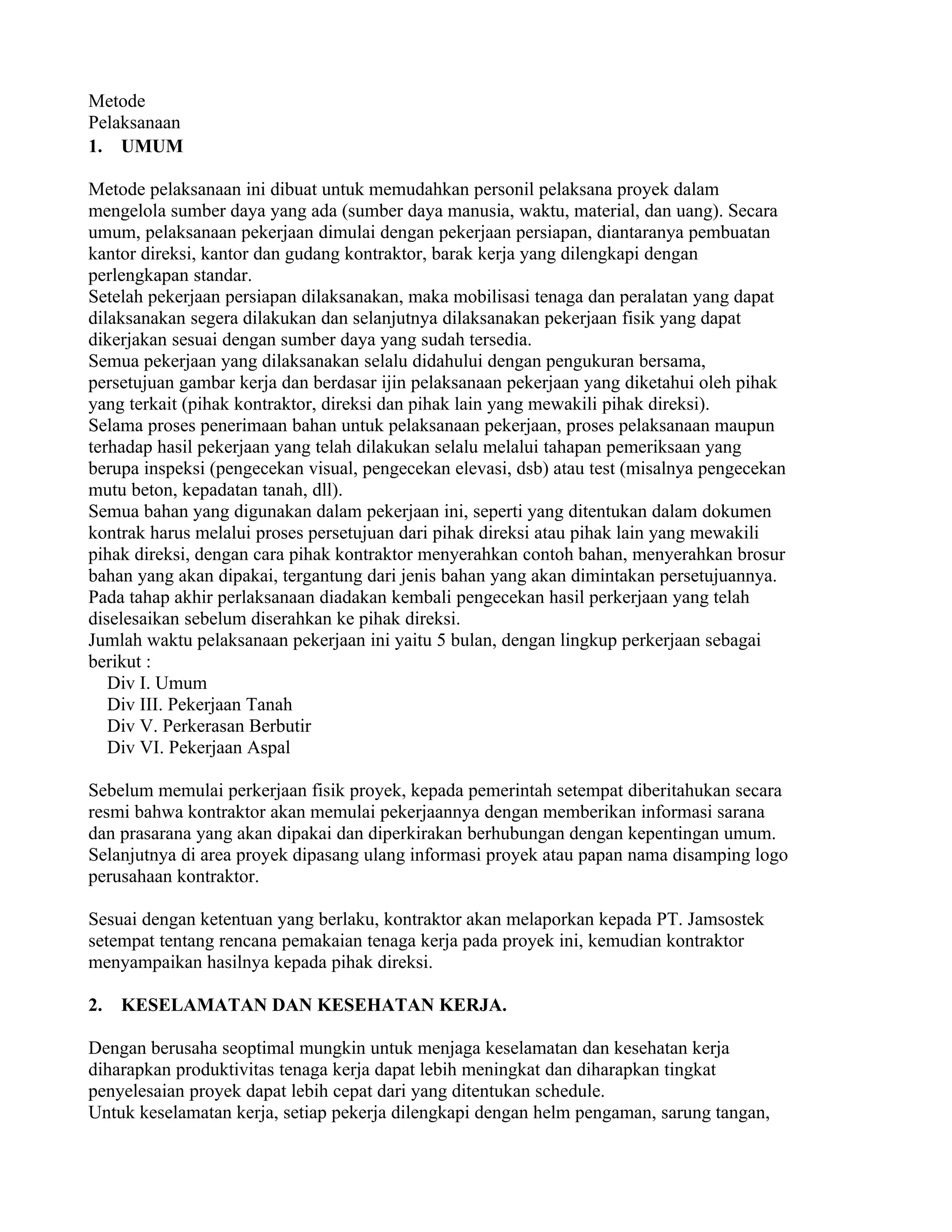 Dokumen ini menjelaskan metode pelaksanaan proyek yang meliputi persiapan, mobilisasi sumber daya, dan pengendalian mutu pekerjaan. Proses keselamatan dan kesehatan kerja serta penempatan bahan diatur untuk mendukung efisiensi dan keamanan. Pengendalian mutu dilakukan secara internal melalui inspeksi dan pengujian sebelum, selama, dan setelah pekerjaan untuk memastikan kesesuaian dengan spesifikasi kontrak.