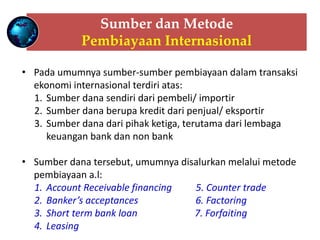 Dokumen ini menjelaskan berbagai metode pembayaran dan pembiayaan dalam transaksi internasional meliputi sumber dana dan sistem pembayaran seperti cash in advance, open account, dan letter of credit. Terdapat juga metode penyelesaian seperti counter trade, factoring, dan forfaiting yang memfasilitasi perdagangan antar negara. Selain itu, penjelasan rinci tentang prosedur dan keuntungan dari masing-masing metode juga disertakan.